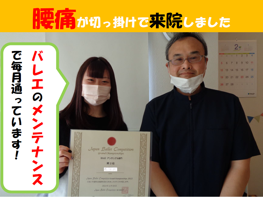 最初は高校生の時に腰痛でのご来院でしたが、今では身体のメンテナンス管理を行っています。