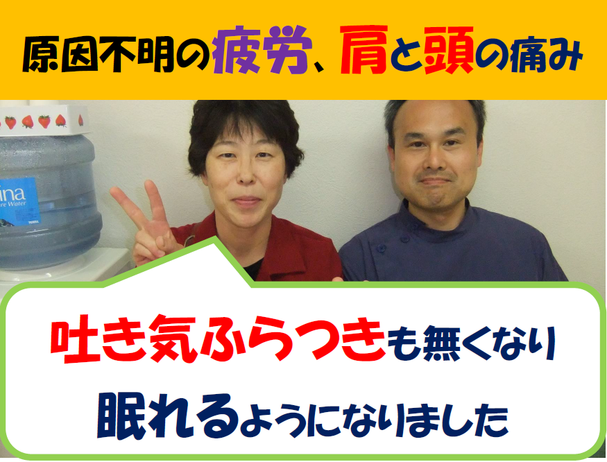 首のズレによる吐き気とふらつきがありました。矯正により症状もなくなり夜もよく眠れるようになりました。